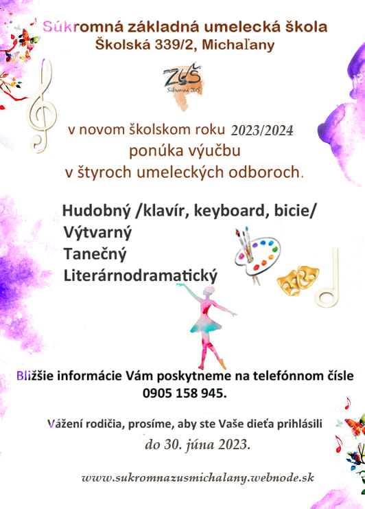Súkromná základná umelecká škola v novom školskom roku 2023/2024 ponúka výučbu v štyroch umeleckých odboroch: Hudobný /klavír, keyboard, bicie/, Výtvarný, Tanečný, Literárnodramatický.